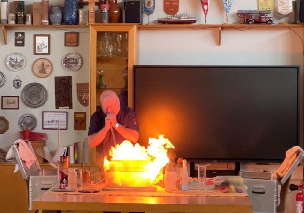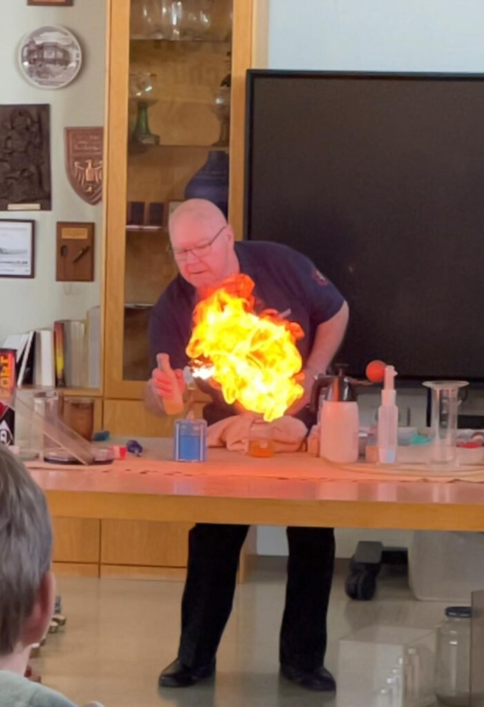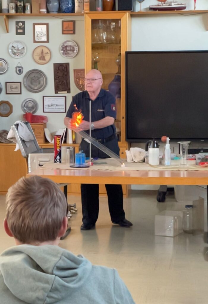 Der Tag begann um 9:00 Uhr mit einer lockeren und sehr unterhaltsamen Kennenlernrunde. Durch verschiedene lustige und kreative Spiele fiel es allen leicht, miteinander ins Gespräch zu kommen und neue Kontakte zu knüpfen. Was eine tolle Grundlage für den weiteren Tag war. Zum Frühstück stärkten sich alle mit leckeren Butterbrezeln, bevor ein ganz besonderes Highlight auf dem Programm stand: Franz Gäng begeisterte die Teilnehmenden mit einem spannenden und zugleich lehrreichen Vortrag zum Thema Brennen und Löschen. Neben spektakulären Effekten vermittelte er auch wichtige Informationen zum sicheren Umgang mit Feuer. Ein Erlebnis, das sicher noch lange in Erinnerung bleiben wird.