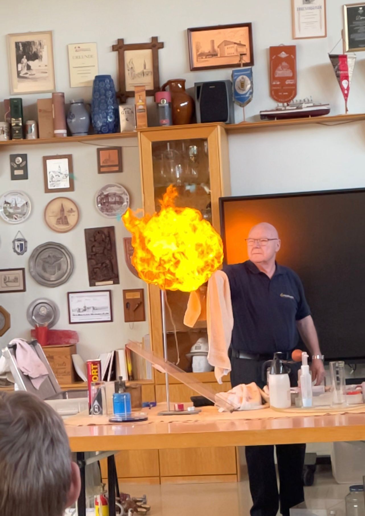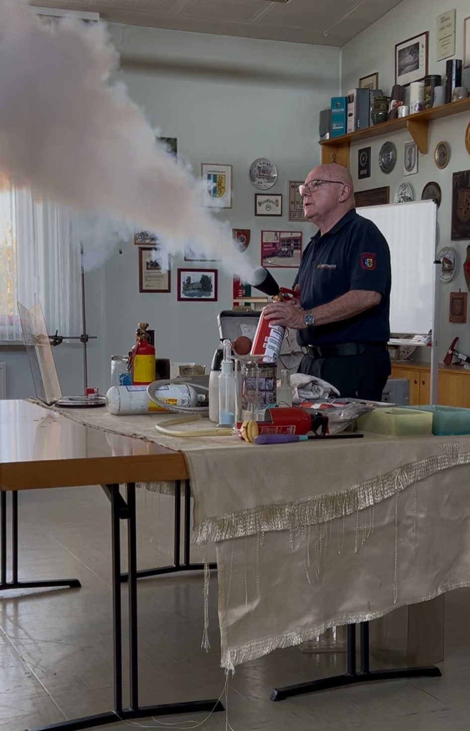 Der Tag begann um 9:00 Uhr mit einer lockeren und sehr unterhaltsamen Kennenlernrunde. Durch verschiedene lustige und kreative Spiele fiel es allen leicht, miteinander ins Gespräch zu kommen und neue Kontakte zu knüpfen. Was eine tolle Grundlage für den weiteren Tag war. Zum Frühstück stärkten sich alle mit leckeren Butterbrezeln, bevor ein ganz besonderes Highlight auf dem Programm stand: Franz Gäng begeisterte die Teilnehmenden mit einem spannenden und zugleich lehrreichen Vortrag zum Thema Brennen und Löschen. Neben spektakulären Effekten vermittelte er auch wichtige Informationen zum sicheren Umgang mit Feuer. Ein Erlebnis, das sicher noch lange in Erinnerung bleiben wird.